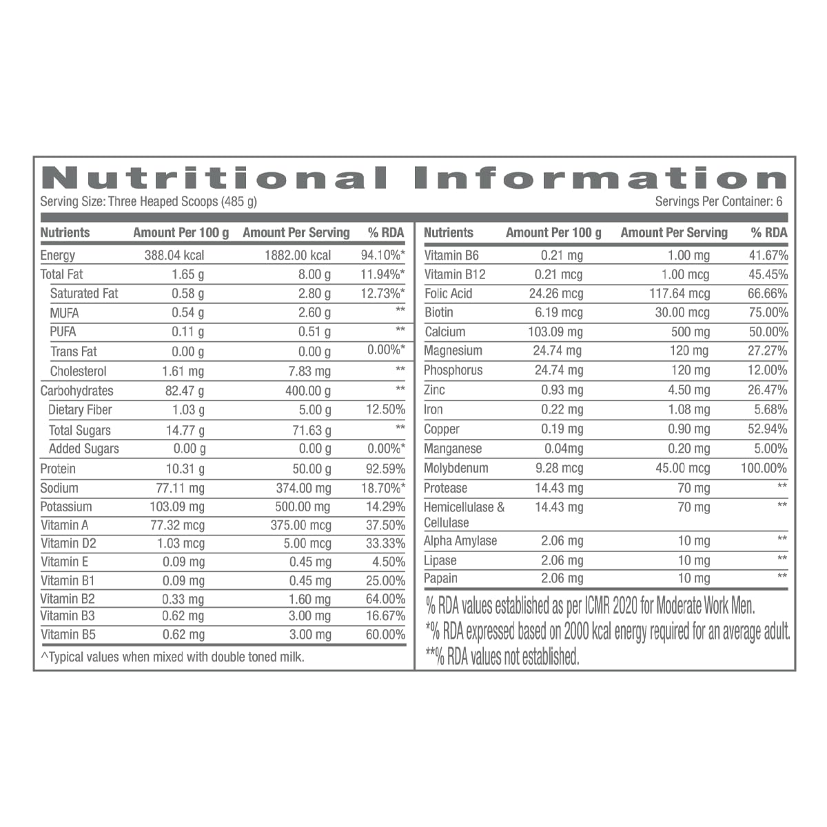 - 𝗛𝗲𝗮𝗹𝘁𝗵𝘆 𝗪𝗲𝗶𝗴𝗵𝘁 𝗚𝗮𝗶𝗻 𝘄𝗶𝘁𝗵 𝗕𝗮𝗹𝗮𝗻𝗰𝗲𝗱 𝗡𝘂𝘁𝗿𝗶𝘁𝗶𝗼𝗻 : Achieve your fitness goals with 73g of high-quality protein, 440g of complex carbs, and 2200 calories per serving, designed to help you gain weight in a healthy and sustainable way.