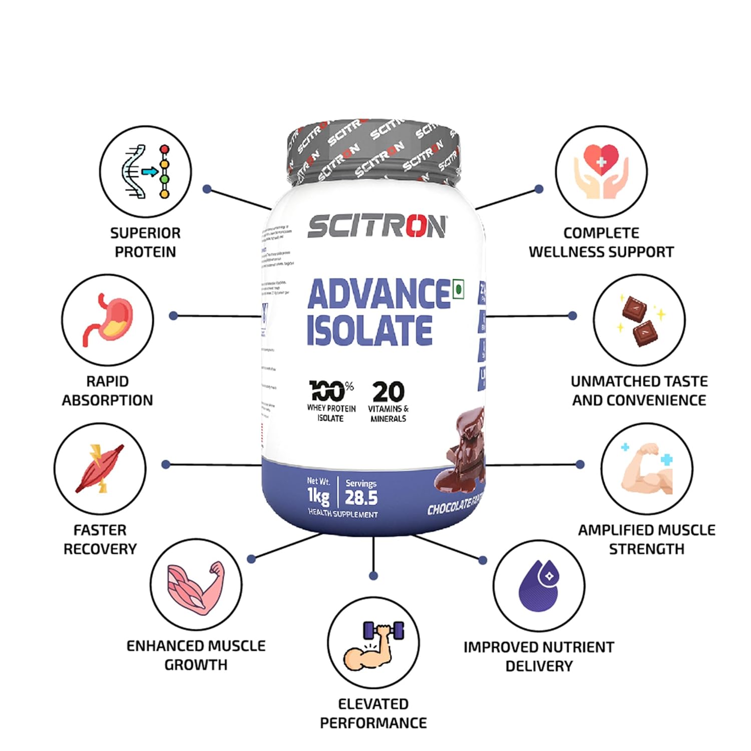 - The superior whey protein isolate: Fuel your gains with Scitron Advance Whey Isolate, a premium protein source for serious muscle builders. Packed with 27.4g of protein per scoop, it delivers the building blocks you need to grow lean muscle.